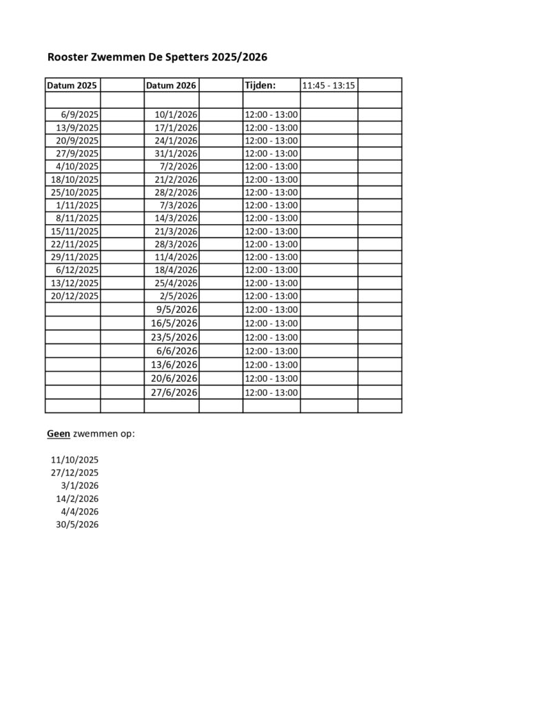 Elke zaterdag van 11:45 uur – 13:15 uur. 12.00-13.00 zwemmen (je bent wat eerder welkom om je om te kleden).